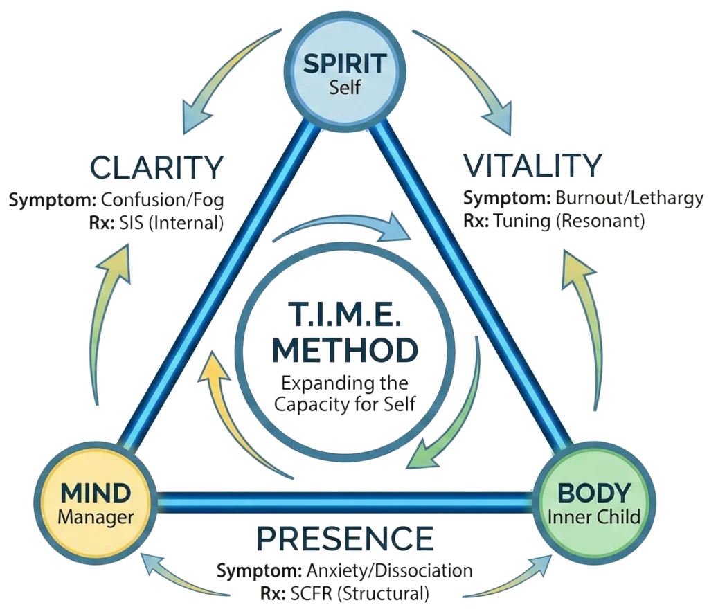My proprietary framework, T.I.M.E. (Triad Integration Method of Embodiment), synthesizes and evolves these powerful, evidence-based modalities into a unified system: